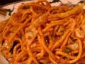 Ingredients: two cups chickpea flour, one teaspoon salt, one fourth teaspoon ground cumin, one fourth teaspoon oregano seeds, one fourth teaspoon paprika, one eight teaspoon cayenne pepper, one large potato, peeled and thinly cut, one fourth cup vegetable oil, one large onion, sliced and separated into rings.